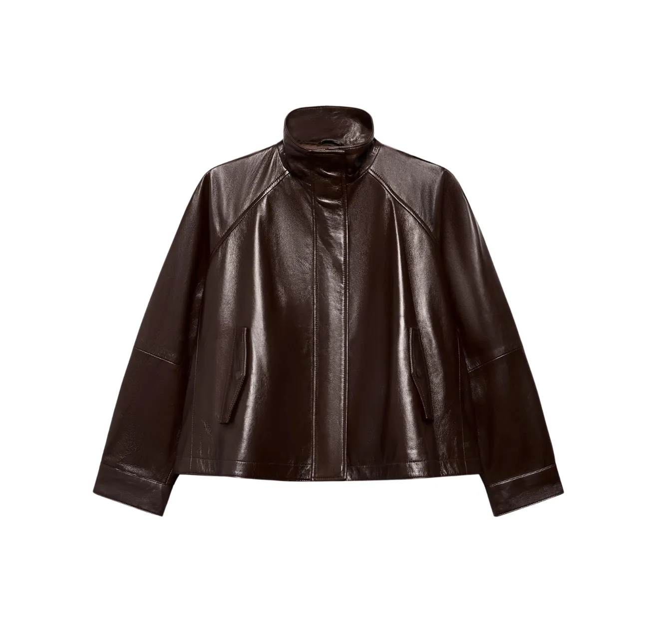 Leather jackets take on more defined, silhouette-driven shapes. Suede textures and smooth finishes bring variation in surface and texture. Boxy shapes and cropped lengths emphasize the jacket's cut. Shades of chocolate, burgundy, and brown take over from the classic black. These jackets are a strong, structured choice for your spring looks.